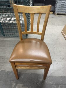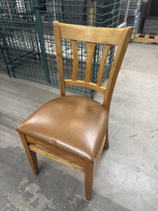Second hand chair: Dining height, brown cover, wood frame. 17”H, 34” overall height.